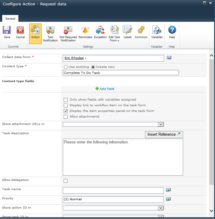 The “Assign To-Do task” workflow action assigns a workflow task and sends a notification to one or more users to complete. The task assignee must perform the task and mark it as complete via a workflow task form before the workflow can continue. The action configuration allows workflow designers to use an existing or create a new content type that inherits from the “Workflow Task” parent content type.