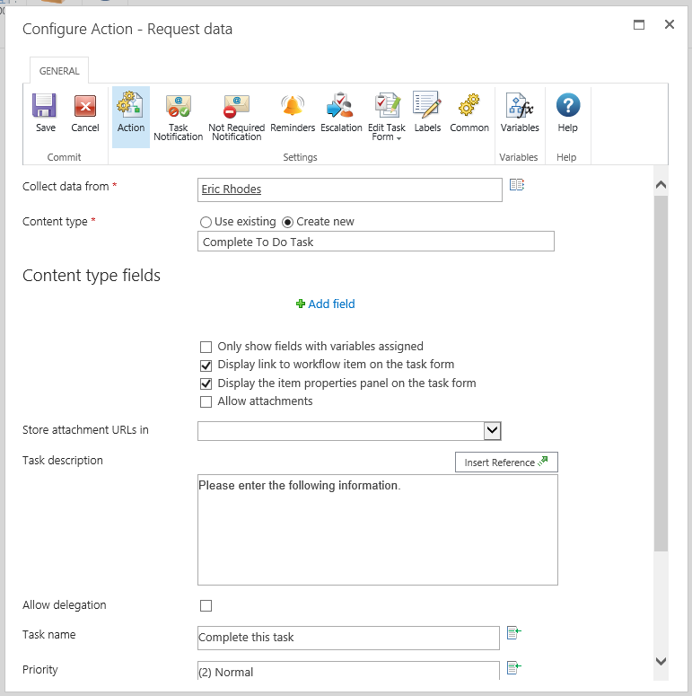 In this post, I want to share with you how to create an “Assign To-Do Task” workflow task form that the assignee can complete by just clicking a button and that has only relevant fields. In order to accomplish this, we need to create a new content type via the “Request Data” workflow action that we can use in the “Assign To-Do Task” workflow action. So let’s get started!