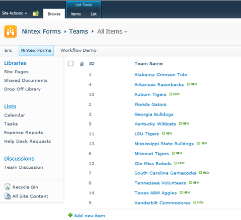 In this example scenario, a user fills out a list form to enter their name and pick their favorite SEC football team via a drop down list. The drop down list control pulls from a Teams list and is auto populated with a default team value (i.e. “Alabama Crimson Tide” in this case).