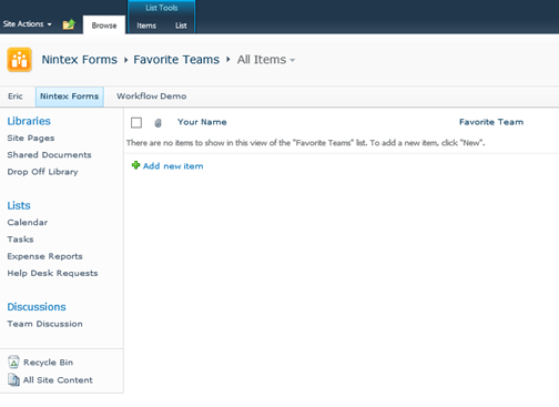 3. Create a Nintex Form in the Favorite Teams list (List Tools > List > Nintex Forms > Customize the Item Form).