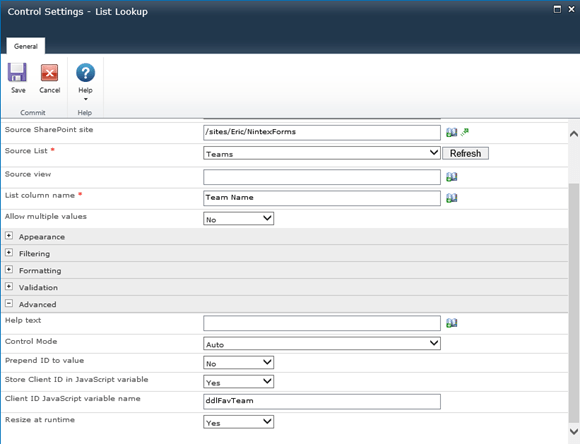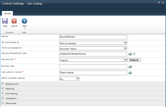 11. Go back to the FavoriteTeam List Lookup control and open the Control Settings.